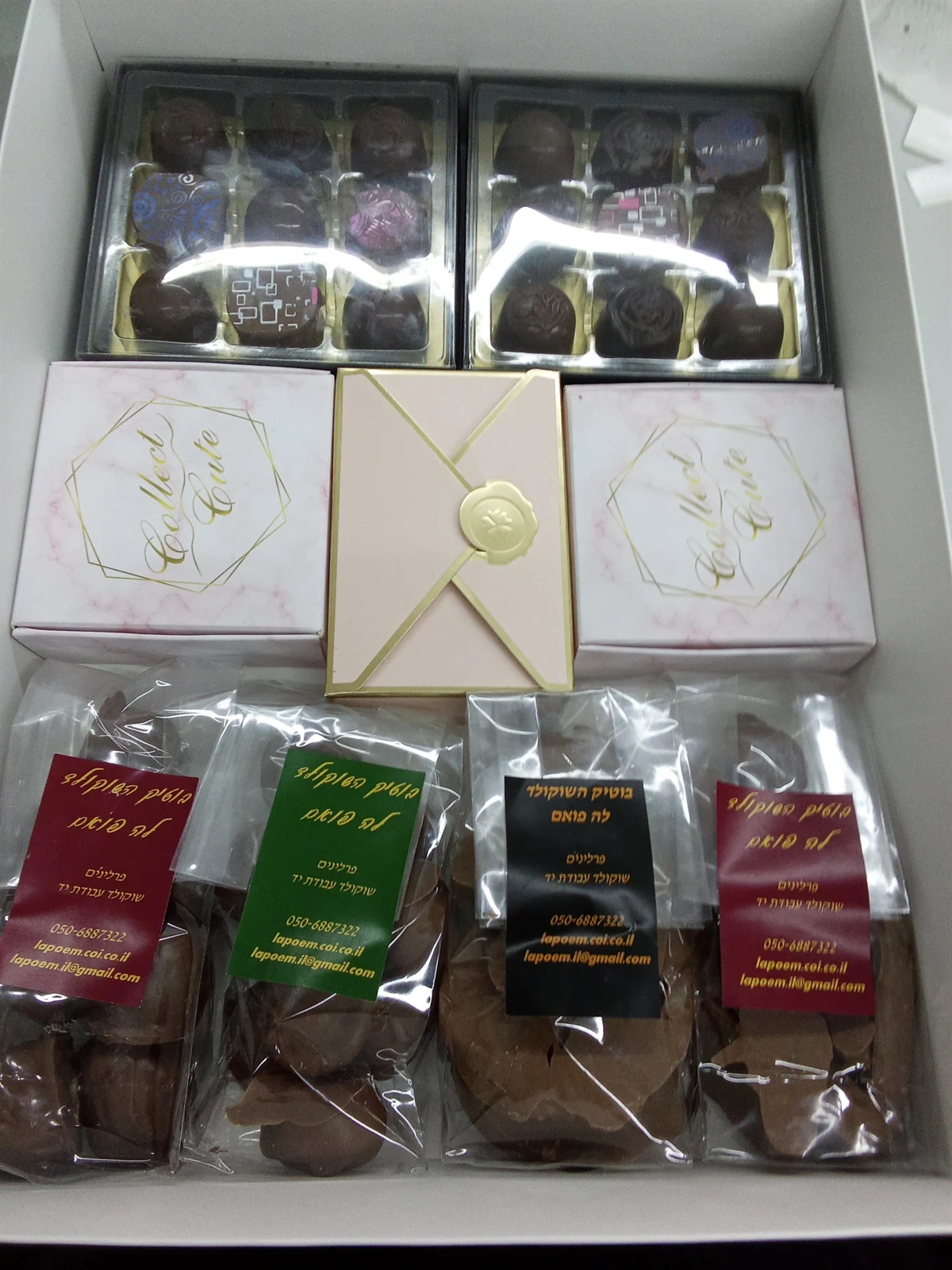 מארז הכולל 80 פרלינים טראפלס טבלאות ומעדני שוקולד עבודת יד פירות בשוקולד מרציפן ועוד